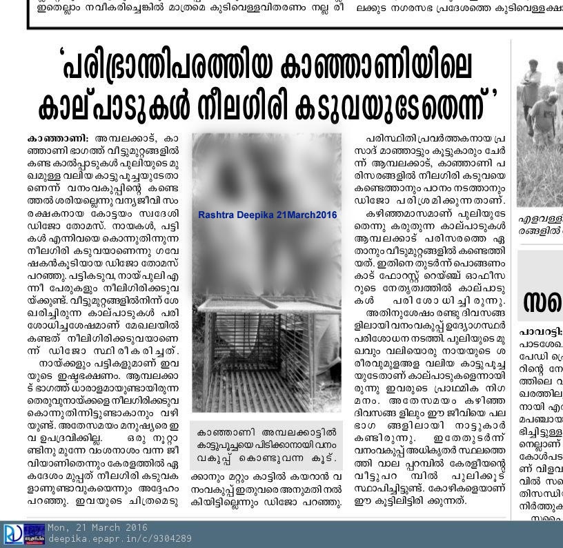 Report in Rashtra Deepika Daily, the most circulated Kerala Evening News Paper, on 21 March 2016 regarding the finding of NeelagiriKaduva, in Malayalam Language