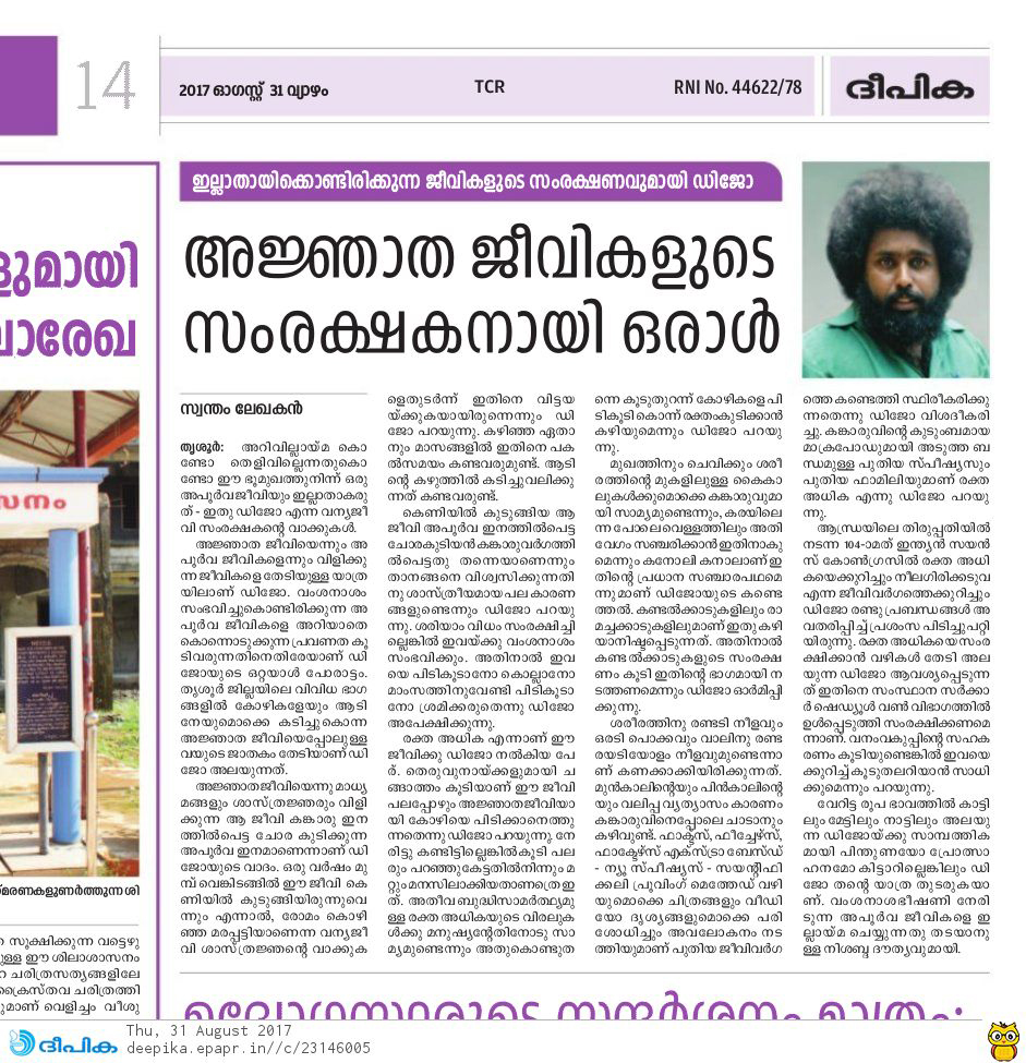 Back Cover Page Report on Raktha Athika - the Vampaire Kangaroo in Deepika Daily, a prominent Kerala & th News Pape & the First News Paper to be Published in Kerala & one of the Oldest in India; on 31 August 2017, regarding the finding of Raktha Athika, & efforts by Dijo Thomas to Conserve it. [in Malayalam Language]